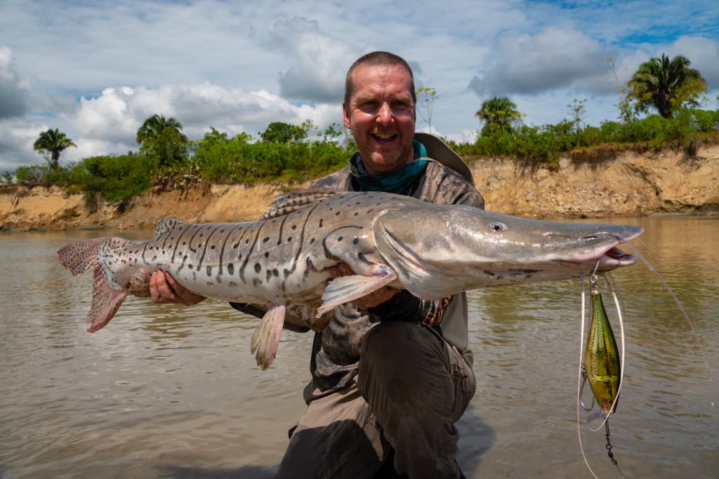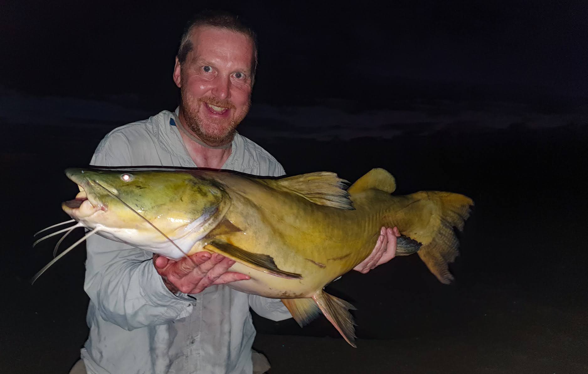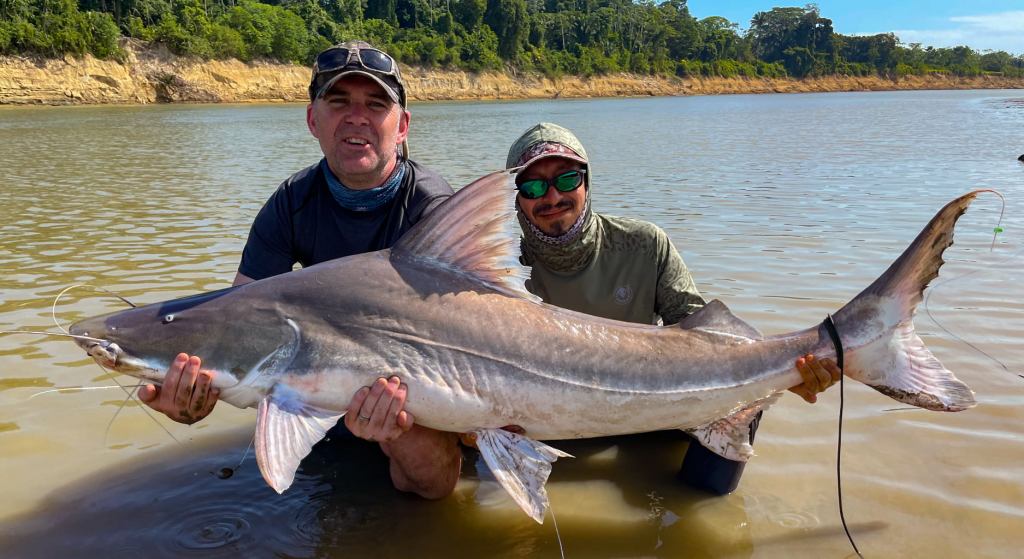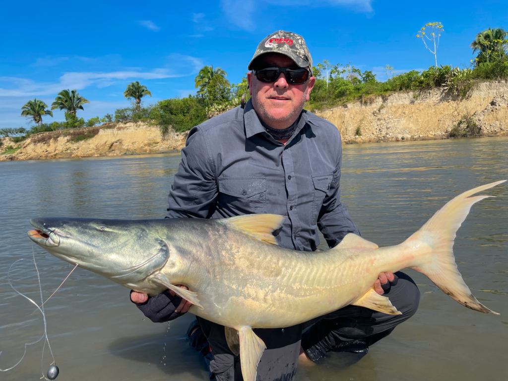 They both drifted livebaits in the current with Dave first to hook up with a large Dorado (Golden) Catfish followed by a big Redtail catfish. Then Dai hooked into a fish he could not stop. They jumped in the boat and followed the fish downstream for several hundred yards, all the time trying to keep it out of the multitude of snags and sunken tress in the river. After a fight of about 45 mins the fish was finally beached on a sandy bank. A Piraiba catfish estimated at 150lb. Truly a fish of a lifetime.