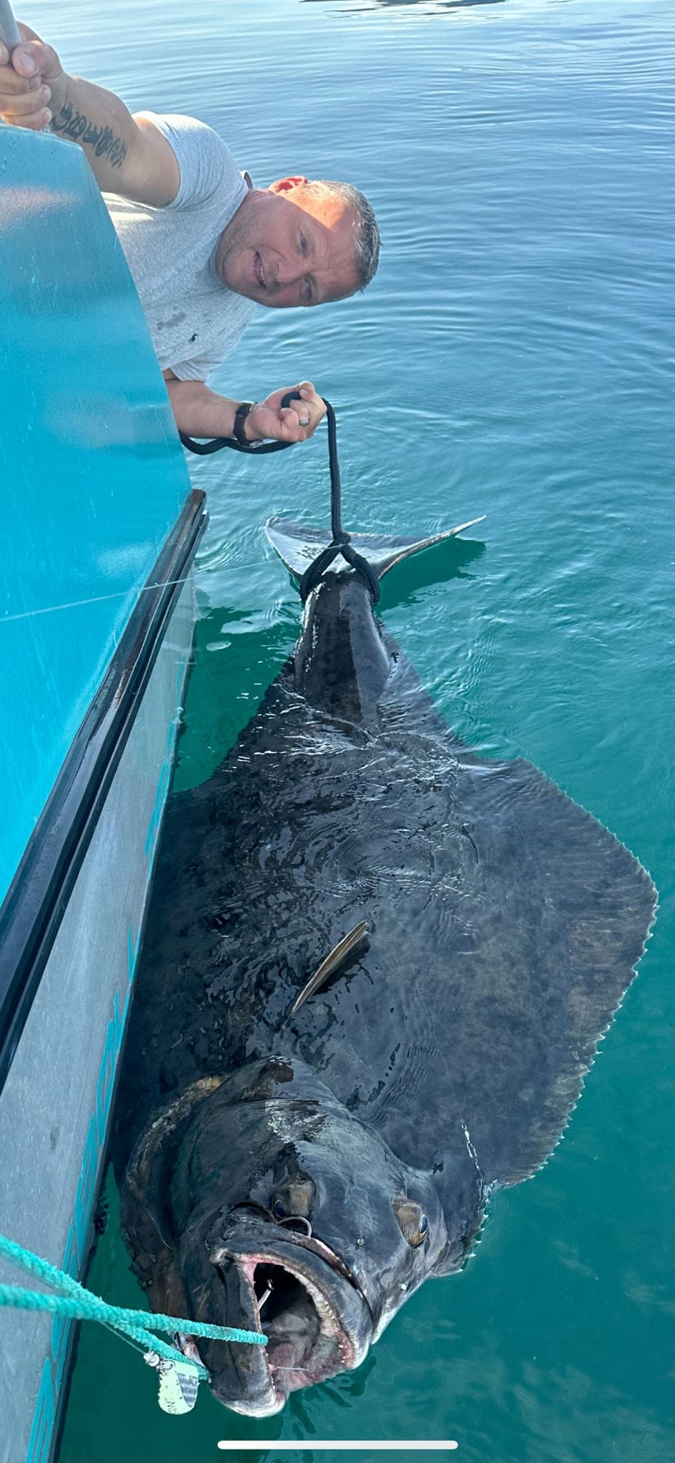 NB fish over 1.5m are not brought onto the boat deck. These larger fish are lip gaffed to get a rope on the bottom jaw. They then have a tail rope attached, so the fish can be measured/photographed before being released.